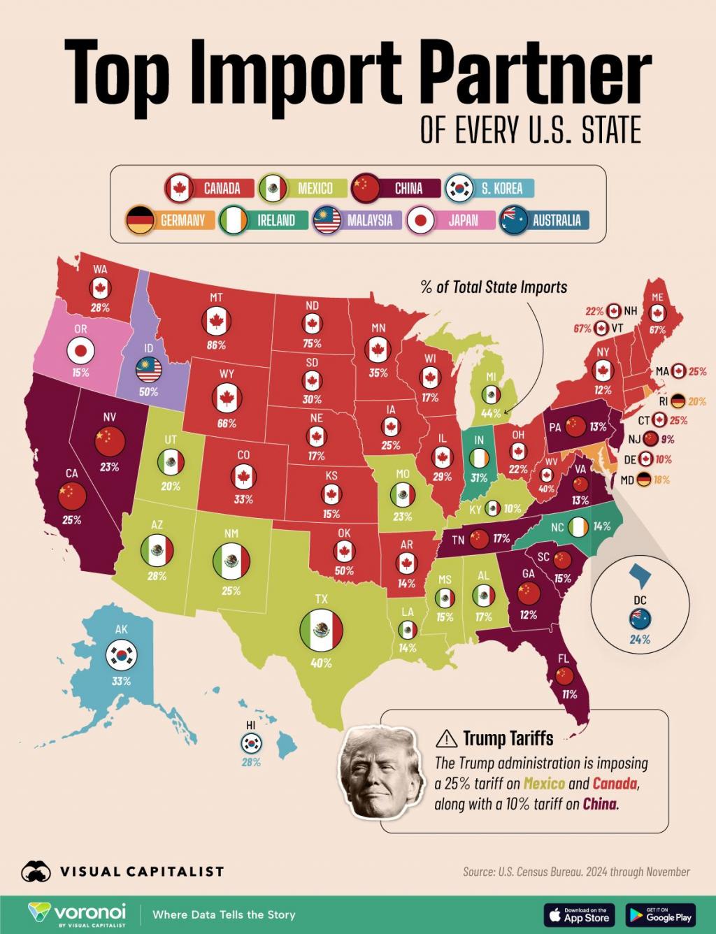 Diese Karte zeigt die wichtigsten Importpartner jedes US-Bundesstaates ab November 2024. Die Daten stammen vom U.S. Census Bureau.