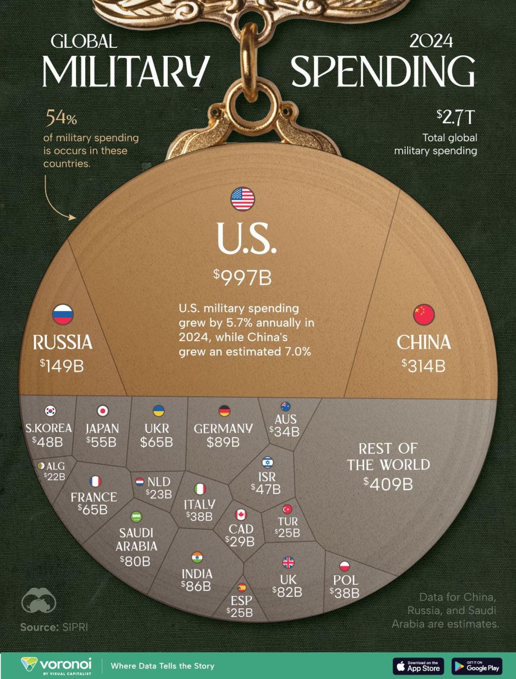 Die Ausgaben Russlands stiegen im Jahresvergleich um 38 % auf fast 150 Mrd. USD. Die Vereinigten Staaten, China und Russland, die oft als strategische Konkurrenten betrachtet werden, machen zusammen 54 % der weltweiten Militärausgaben im Jahr 2024 aus.